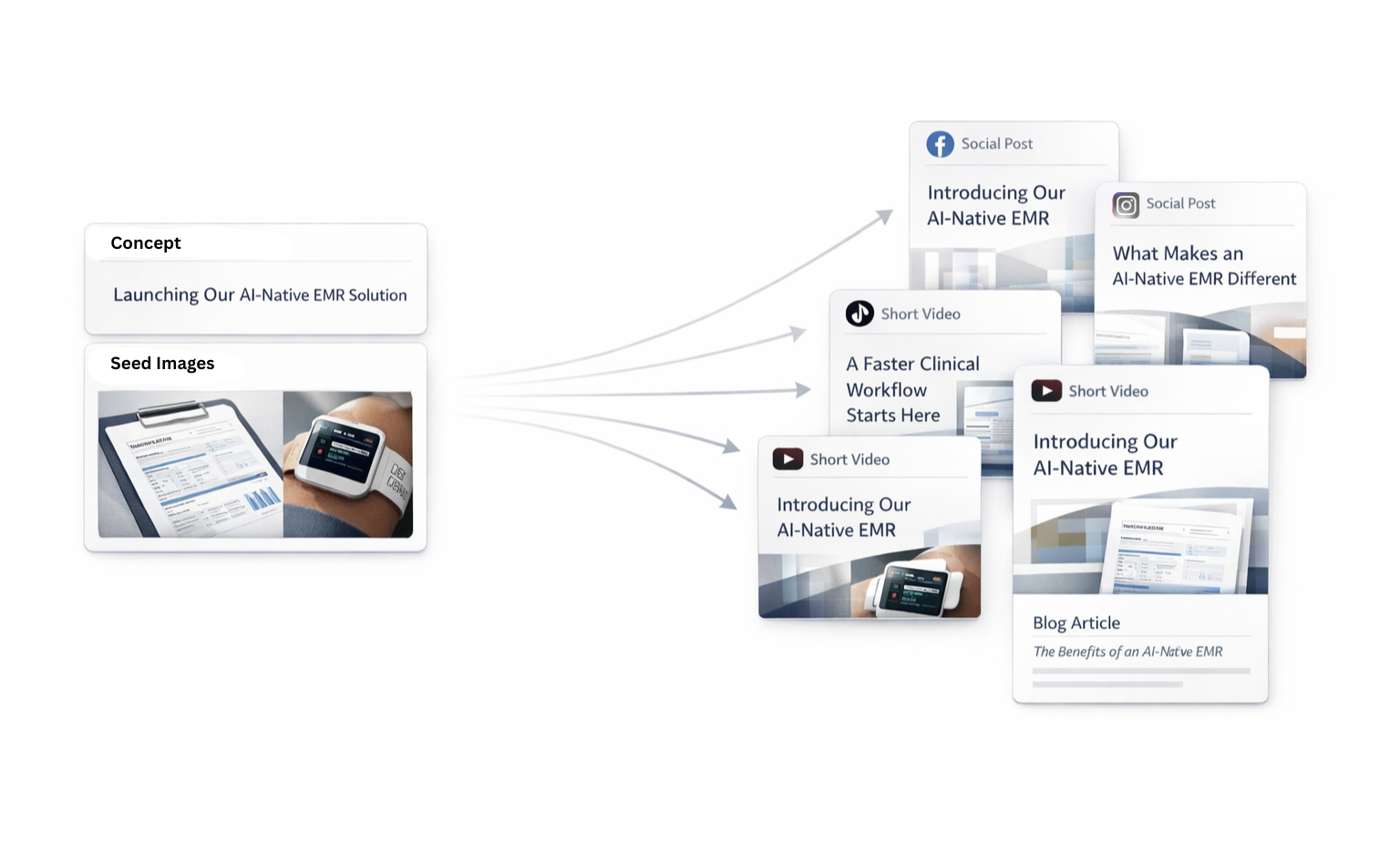 A single content idea often becomes separate planning, drafting, and formatting work across blog, social, and video, with extra handoffs at every step.
