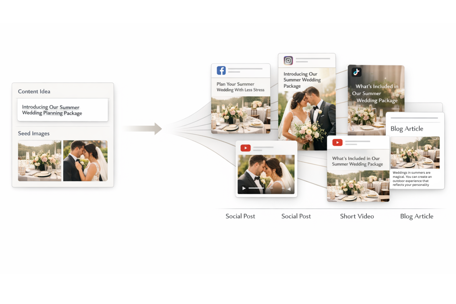 A single idea becomes a blog post, social posts, and maybe a video—each created separately, each requiring its own effort.